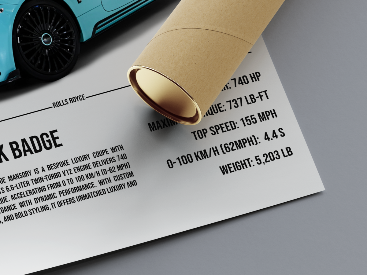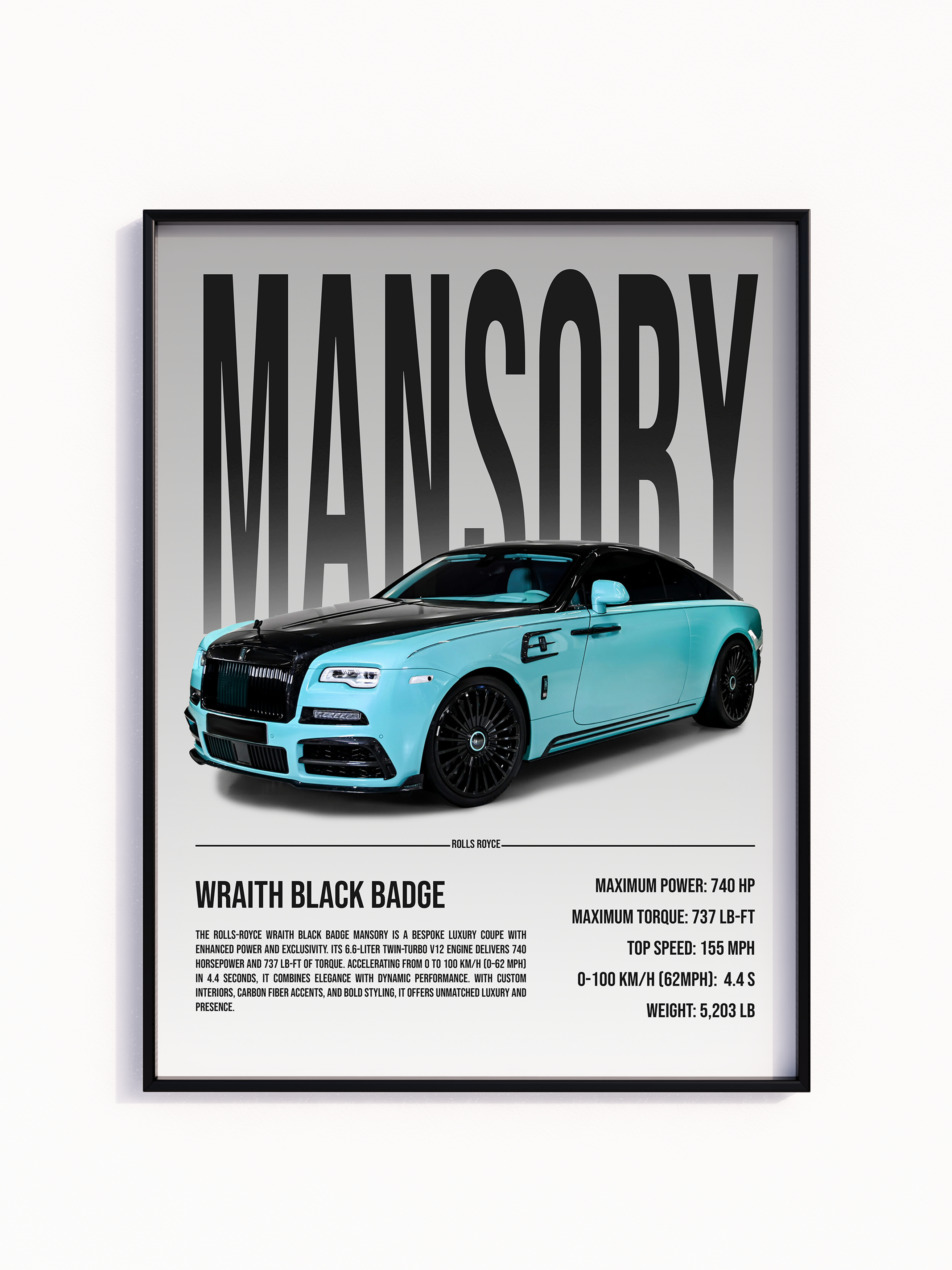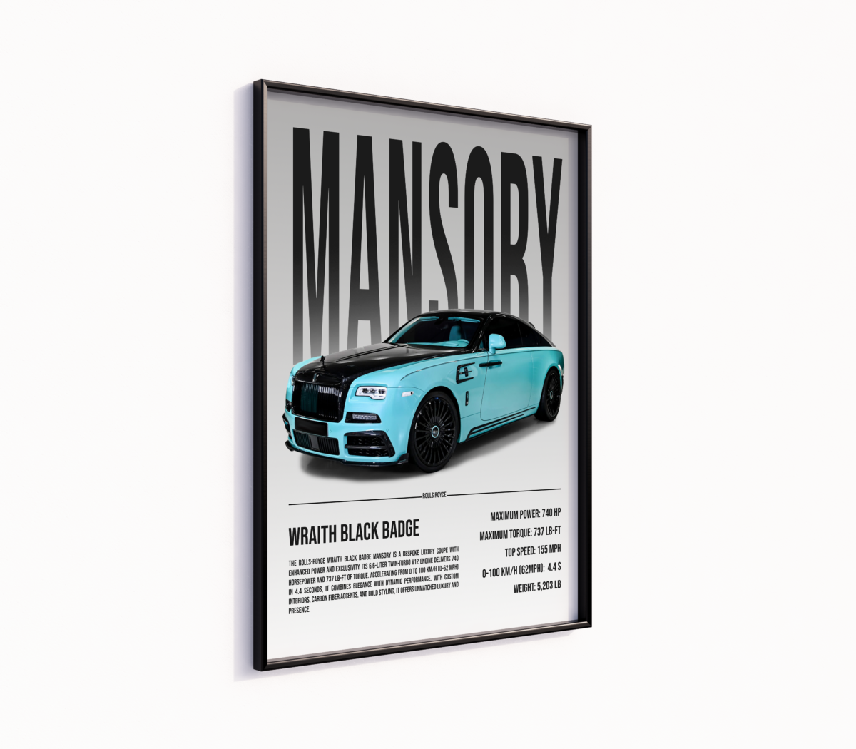 Embrace the essence of the Rolls Royce Wraith black badge Mansory with this exquisite, high-quality illustration. Perfect for decorating children’s rooms, nurseries, playrooms, bedrooms, or office spaces, this wall art print is crafted to captivate and celebrate the beauty of this remarkable vehicle.